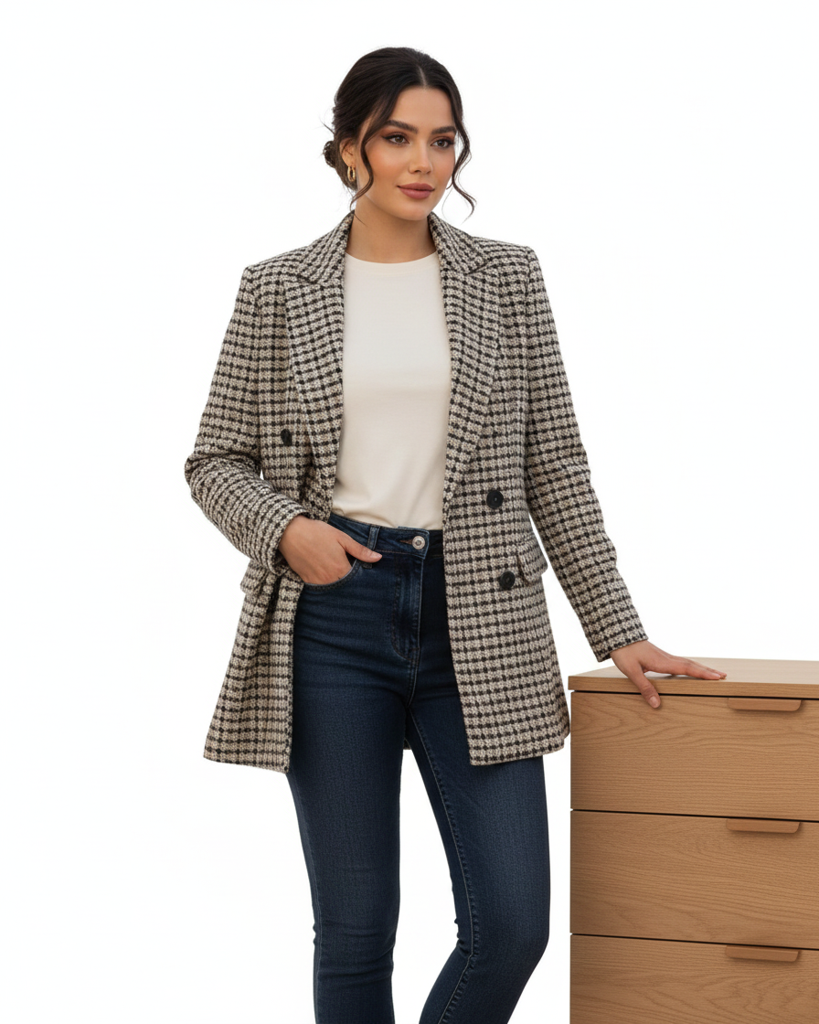 بليزر شتوي بتصميم أنيق وكلاسيك، مناسب للشغل والخروجات في الأجواء الباردة. القَصّة مستقيمة ومريحة بتدي شكل مرتب ومتناسق، مع تصميم كاروهات يضيف لمسة فخمة وسهلة التنسيق.