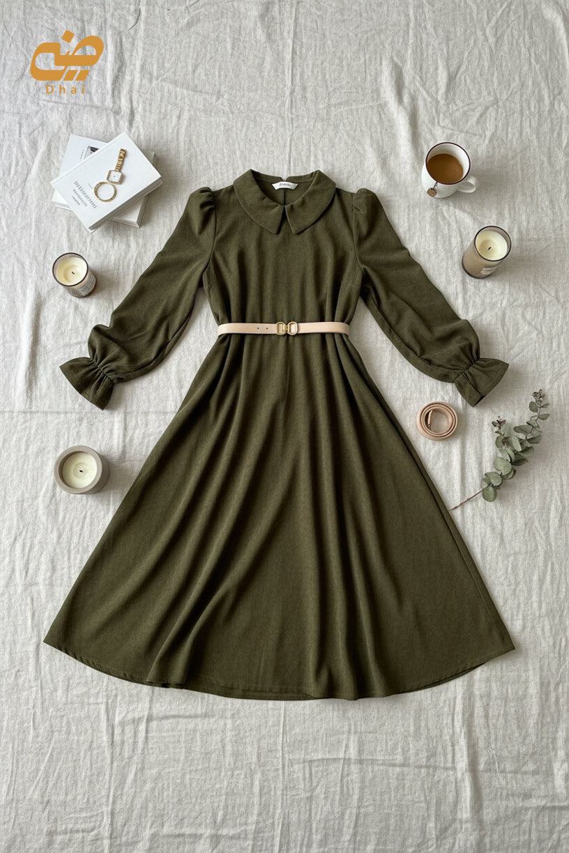 فستان أنيق بلون أخضر زيتوني، مصنوع من قماش فاخر، ناعم ومتين، ومريح للارتداء طوال اليوم. مصمم بياقة كلاسيكية، وأكمام منفوخة، وقصة انسيابية أنيقة على شكل حرف A. الحزام البيج المرفق يضفي لمسة راقية، ويبرز جمال الخصر ليمنحكِ مظهرًا جذابًا. مثالي للنزهات اليومية، وللإطلالة البسيطة، وللإطلالات الموسمية الأنيقة.